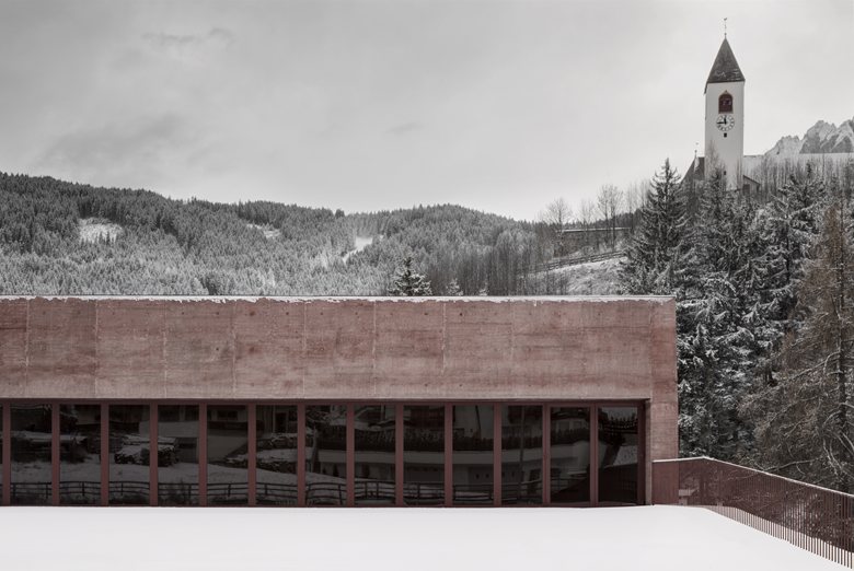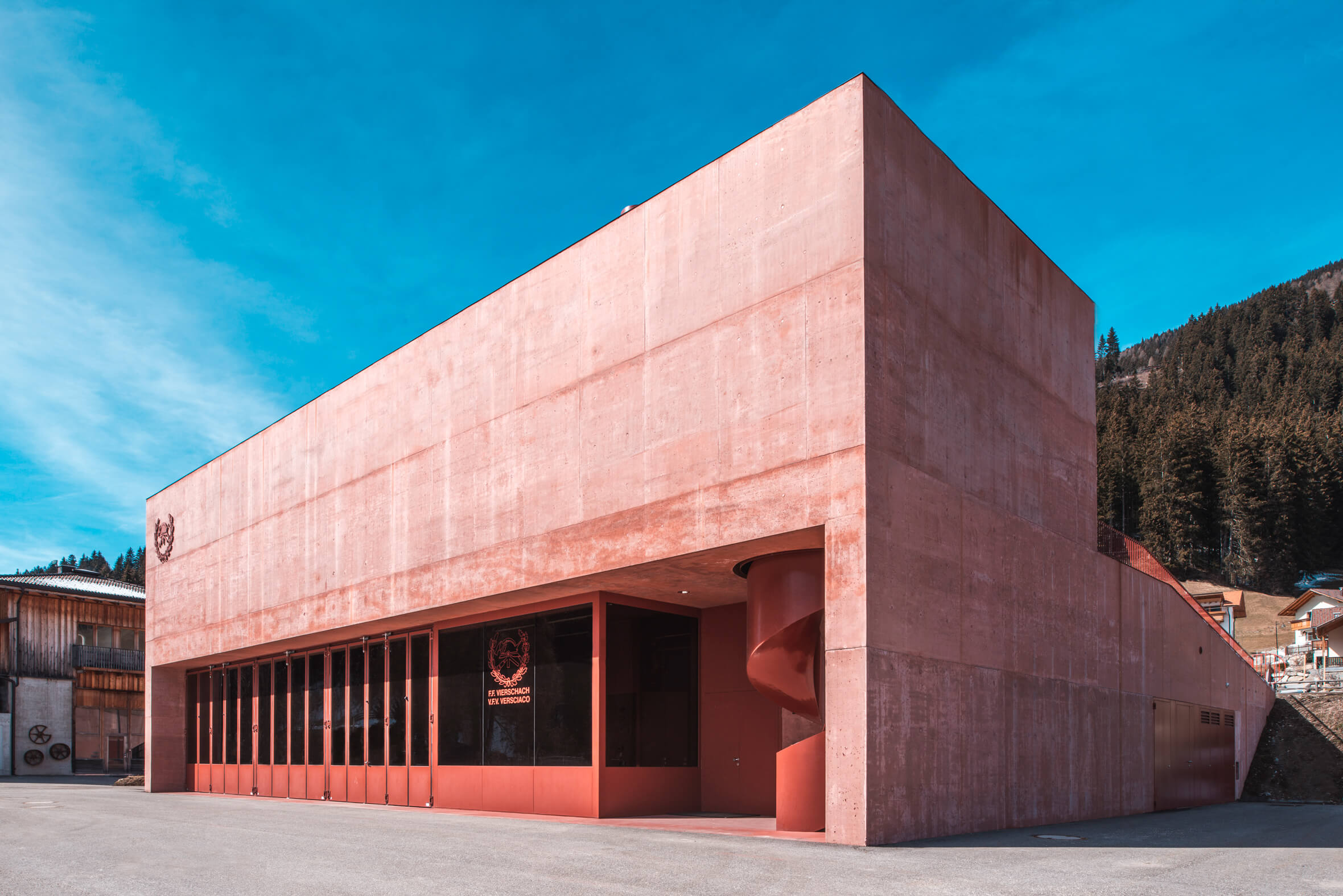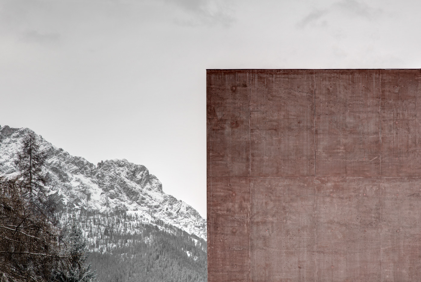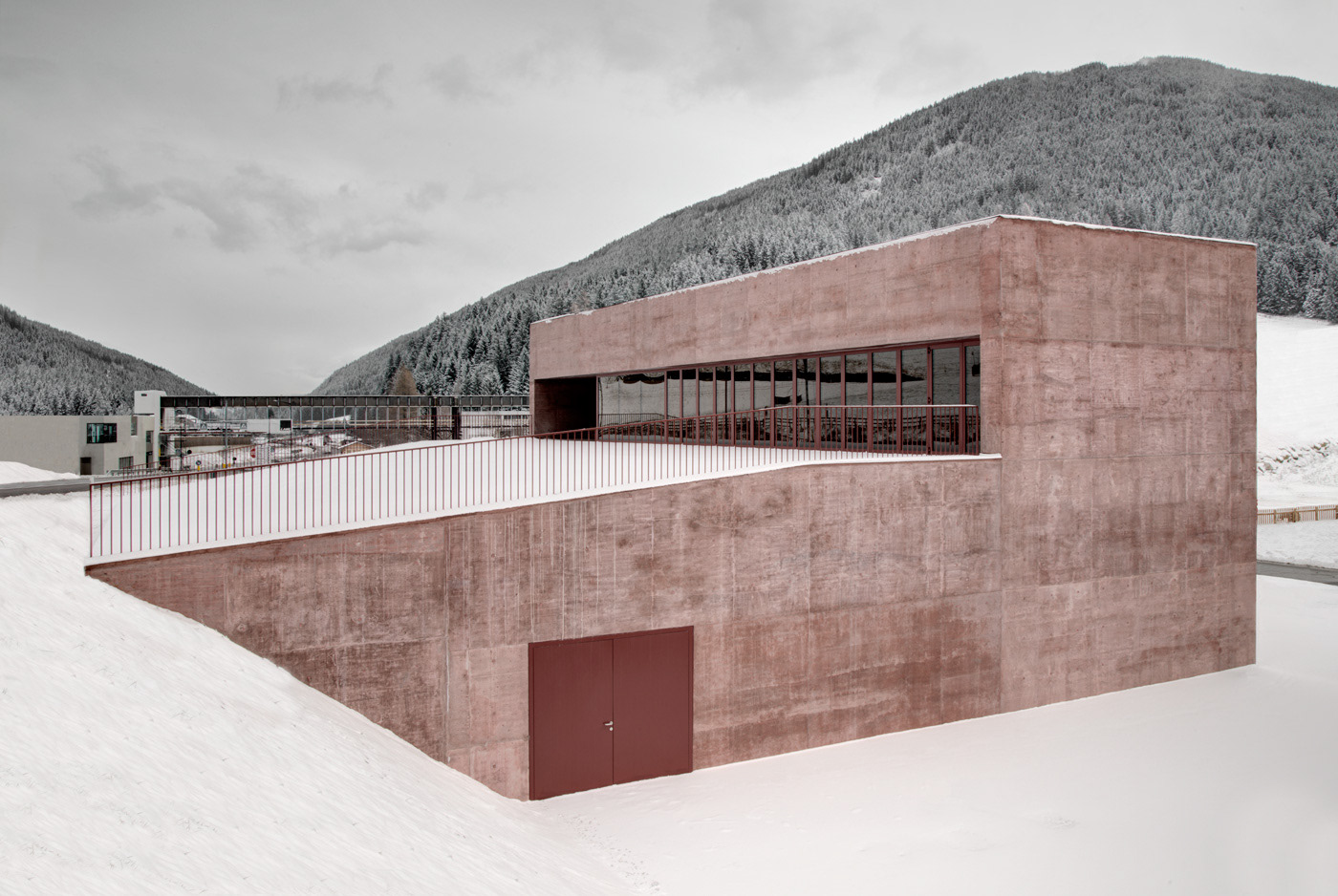 Realizzato in calcestruzzo alleggerito con l’aggiunta di aggregati leggeri (argilla espansa) secondo la norma DIN EN 13055, il rivestimento esterno dell’edificio garantisce un eccellente isolamento termico, rendendo superflue ulteriori misure isolanti. Oltre alle funzioni portante e coibente, il calcestruzzo alleggerito a vista, di colore rosso, protegge la facciata anche dagli effetti del gelo.